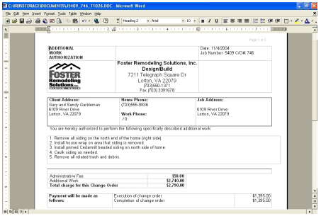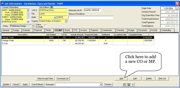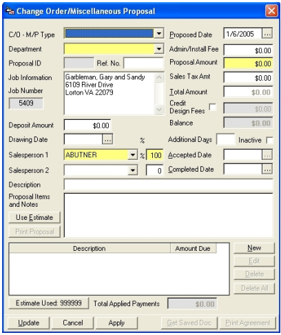 RBS allows you to keep track of each Change Order on a job. There is also the functionality to write small Miscellaneous Proposals for things such as Painting jobs or Interior Design work. You will create these documents in another section (see Setting Up Templates and Reference Admin). Once these documents have been created and mapped, they will be available for use in this tab.