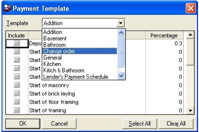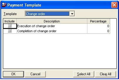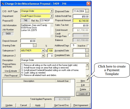 To set up a payment template to go with this contract, click on New and a Payment Template box will appear. (These payment templates have been previously set up. See “Setting up Payment Templates” for more details.)