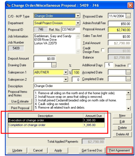 Proposal Items and notes: You can manually type your proposal items in this box. Double click on this box to produce a larger box to type details in. If you have revised your estimate to reflect this change order you can click on the “Use Estimate” button. This option will bring the entire contents of your estimate into the change order screen. Double click on the box for an expanded view. You will then need to delete any part of the estimate that you do not want to add to your change order. Then click OK. Also, be sure to adjust the Change Order Amount accordingly.