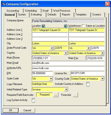 Logo Filename - Enter the name of your file where your Company Logo is. This will allow RBS to pull your logo and insert it in to certain documents. Include Country in Address If you would like the country printed along with your address, put a check mark in this box. Initial Related Type Choose a document from the drop down box. This document will be the Default document that appears on the General Tab in the Report generator box. Required Field Background Color This should default to Required, just leave it as Required. Log System Activity Check this box if you want RBS to log system activities.