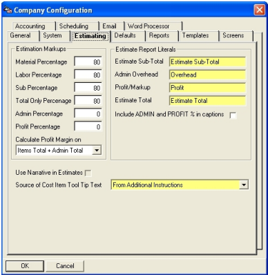 Material Enter your Material Mark-up Labor Enter your Labor Mark-up Sub Enter your Sub Mark-up Total Enter your Totals Admin Enter your Admin Mark-up Profit Enter you Profit Mark-up Estimate Report Literals Estimate Sub-Total Leave default Admin Overhead Leave default Profit/Markup Leave default Estimate Total Leave default Include ADMIN and PROFIT Use Narrative in Estimates If this box is checked the narrative will appear Source of Cost Item Tool Tip Text Click on the drop down and select From Additional Instructions