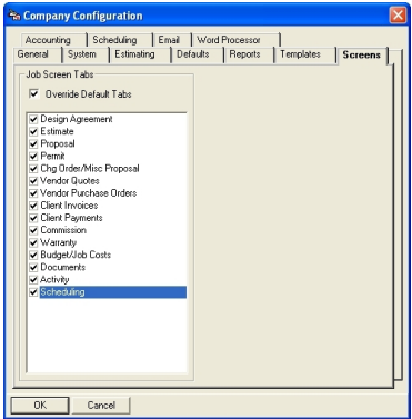 Override Default Tabs 0 This function will allow you to view ONLY the tabs your company uses in a job. There are currently 16 tabs in a job. If your company does not use design agreements or Commissions, you can turn these tabs off by simply unchecking them. This means you will only be able to see 14 of the 16 tabs, or whatever you choose.