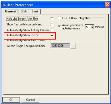 A User Preferences form will be displayed. Check the box to automatically display the In-Box when RBS starts. Uncheck it to not display it when RBS starts.