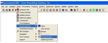 To set up Group Functions you will need to: 1. From the main toolbar in RBS, click on Admin>Access Security>Group Functions