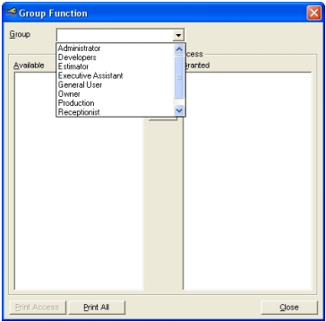 A Group form will be displayed. Select the Group from the dropdown to see the available and granted functions for each group
