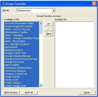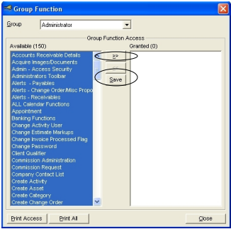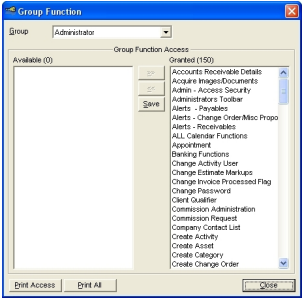 For example: You may not want your receptionist to have the ability to enter an estimate so you can turn that function off for the receptionist. You will need to decide what functions you want each user to have the ability to do within your company.